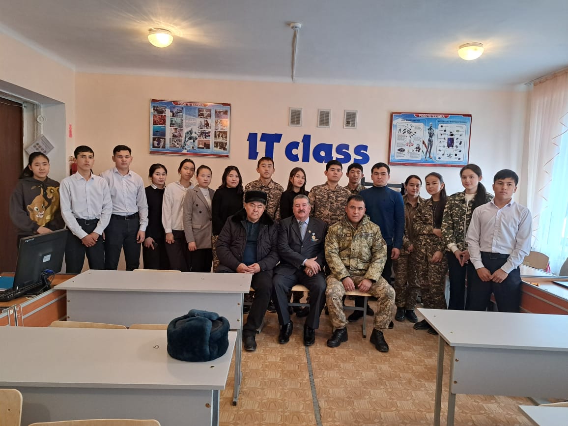 2022-2023 оқу жылының 15 желтоқсан күні мектебіміздің 10 сынып оқушылары Ауған соғысының ардагері Шералиев Алиасқар мен ПСКНБ Шекара қызметі капитаны Н. Қартқұжақпен кездесу өткізді. Кездесу мақсаты: ҚР ҰҚК Шекара қызметі Академиясына оқуға түсуге үгіт насихат жүргізу.