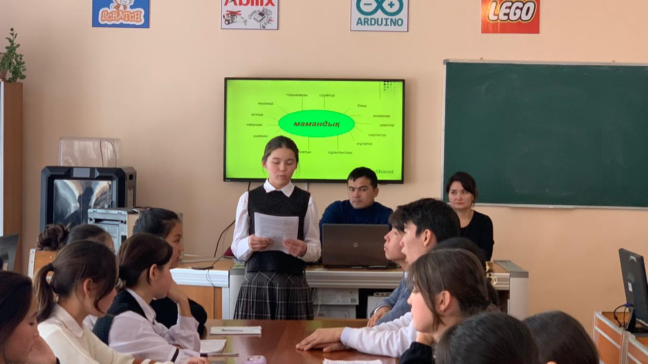 Оқушыларға мамандық таңдау мәселесін белсенді арттыру, мамандық әлемі туралы ақпараттар алу арқылы және балалардың ой қабілеттерін кеңейту ,мамандық бағытын таңдауда жауапты шешім қалыптастыруы. Оқушылардың қабілетін,бейімін психологиялық тесттер мен дидактикалық ойындар пікір-талас арқылы қызығушылықтарын мамандыққа сай тани білді. Адам өз өмірінде екі нәрсені таңдауда қателеспеуі керек: Біреуі -жар таңдау, екіншісі-мамандық таңдау деп М.Мақатаев атамыз айтқандай, мамандықты таңдау -жасөспірім кездегі адам өміріндегі ең маңызды шешімдердің бірі. Бүгінгі кездесу сағатымызға келген қонақтарымызға рахметімізді айта отырып, болашақта қай бағдарда оқитындары,өз қызығушылықтарымен қабілеттеріне сәйкес келетін мамандықты анықтауға, оқушыларға өз таңдауларын жасауға үлкен септігі тиді деп ойлаймын.