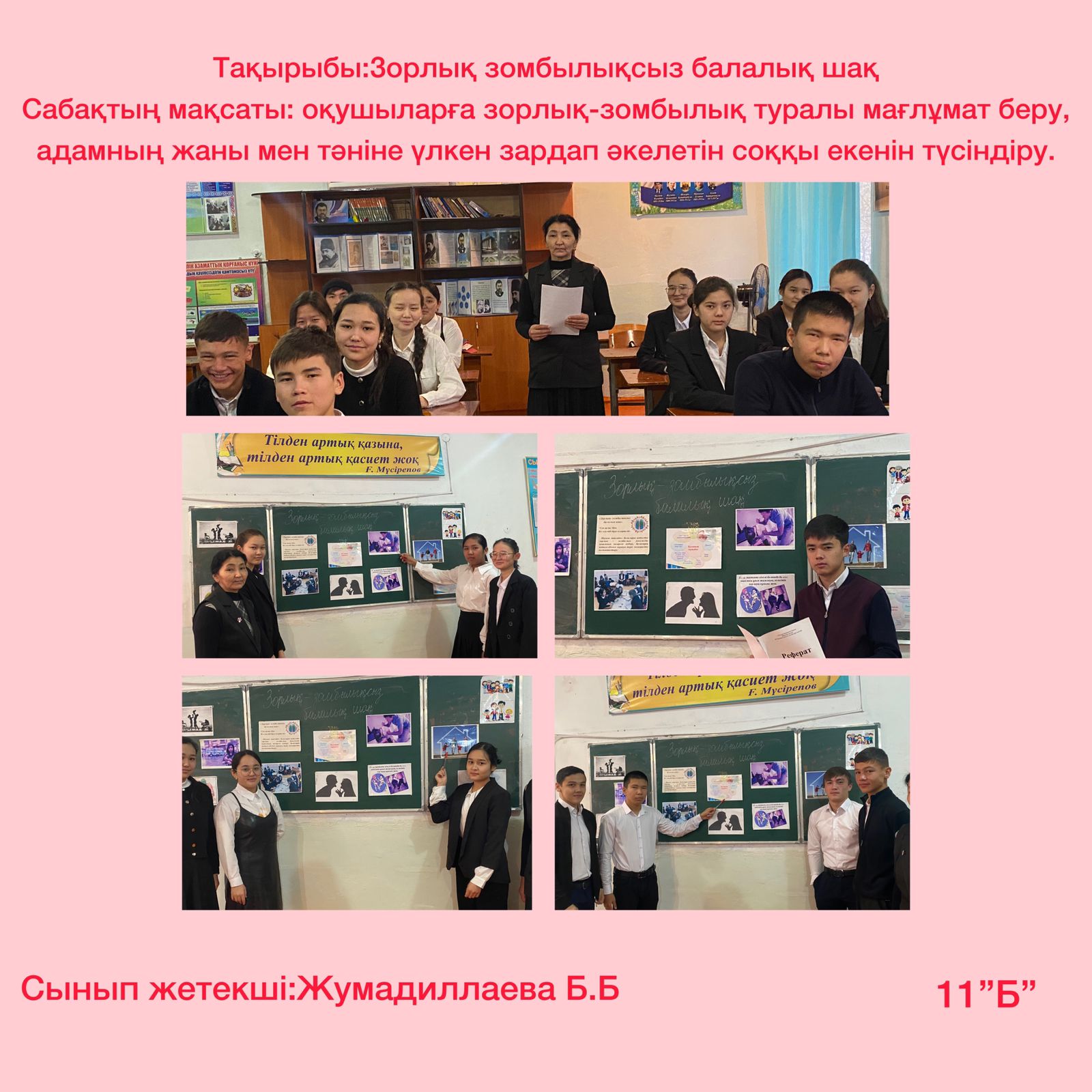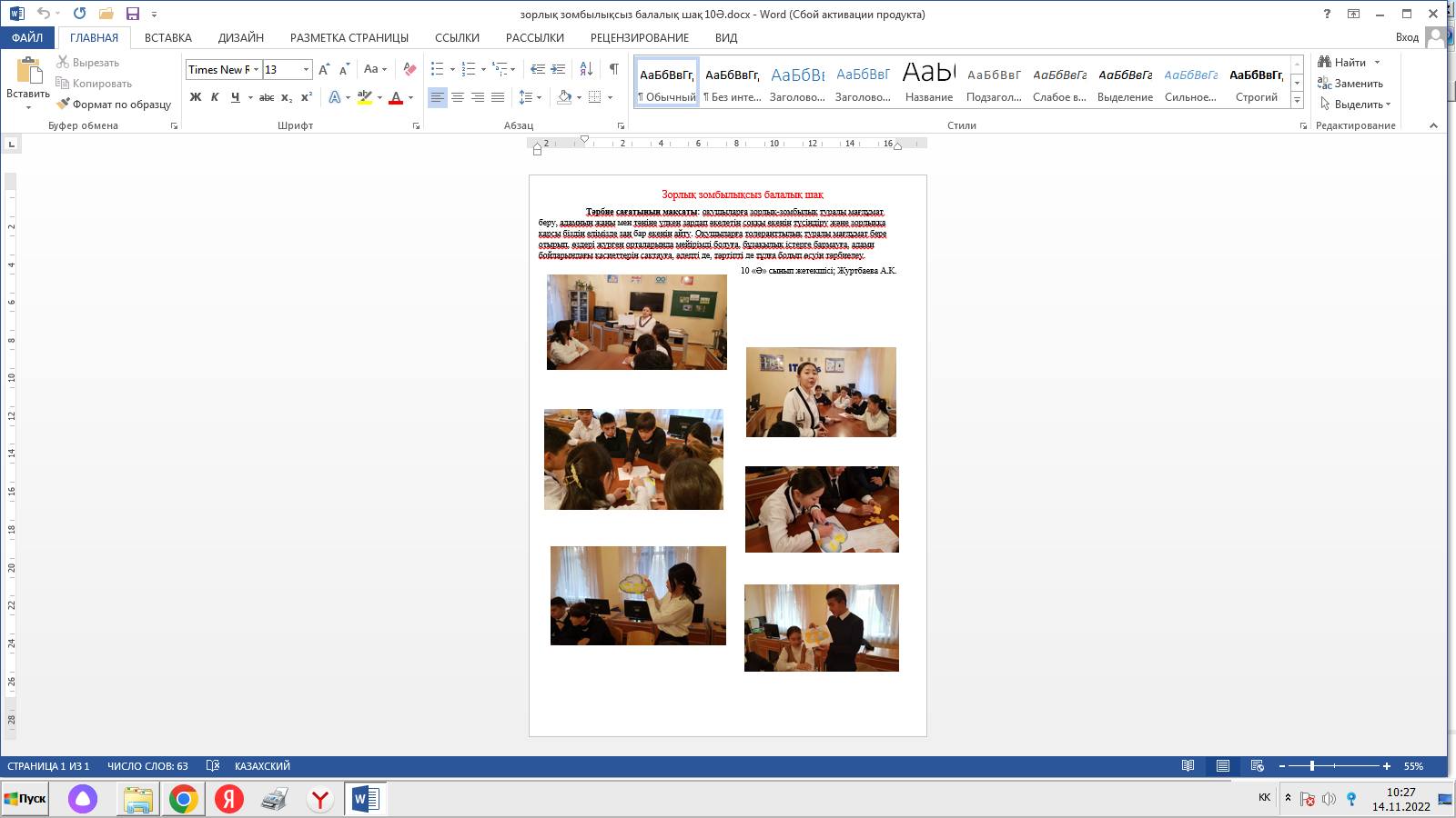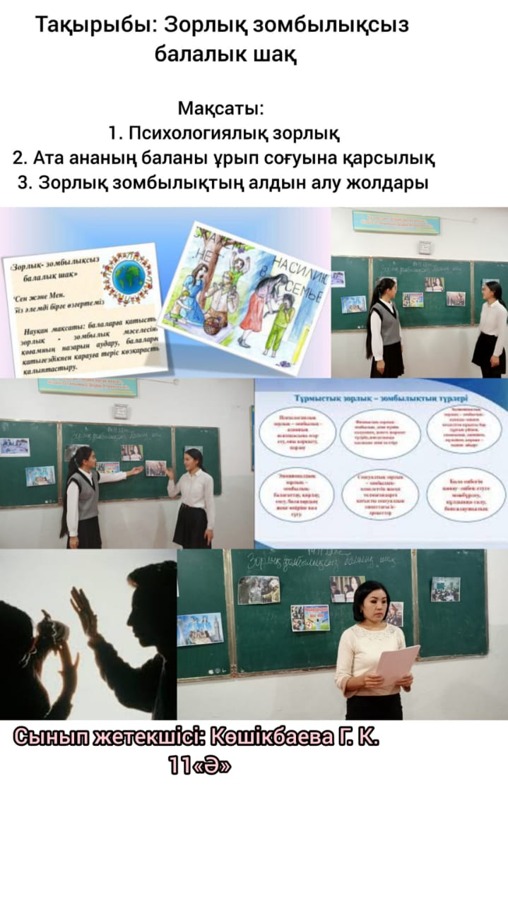 « Бала құқығы – адам құқығы» тақырыбында М. Горький атындағы жалпы орта мектебінде 2022 жылғы 8-20 қараша аралығында « Қатыгезсіздік және зорлық- зомбылықсыз балалық шақ » ақпараттық науқанын өткізу жөніндегі іс-шара жоспарына сәйкес 14 қараша күні 1-11 сыныптар арасында Бала құқықтары туралы конвенциясы оның ішінде зорлық- зомбылықтың алдын алу мәселесі бойынша өзекті тақырыптарға сынып сағаттары өткізілді .