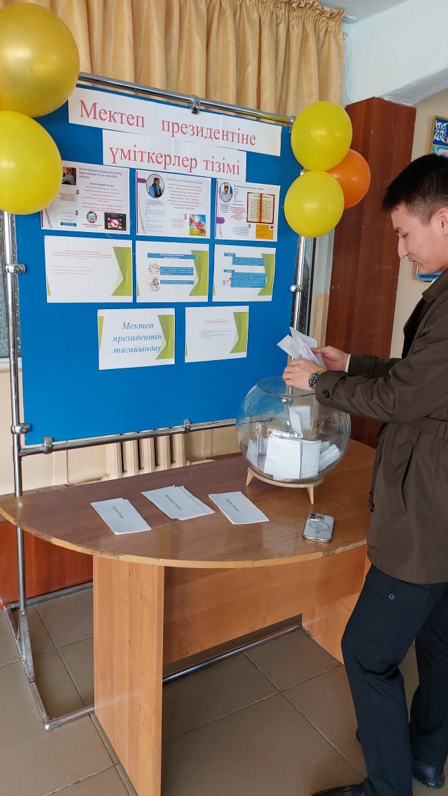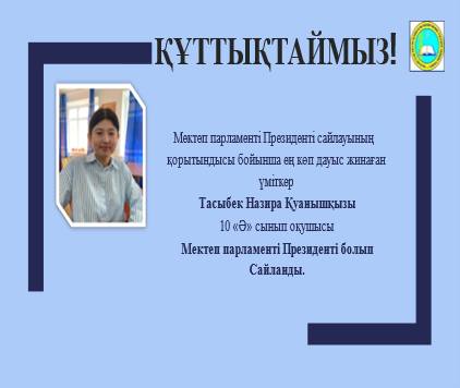 Биылғы мектеп Президенттігіне үміткер болып үш білім алушы тіркеліп, өздерінің жұмыс жоспары мен алға қойған мақсаттарын жариялап, үлкен белсенділік танытты. Президенттікке үміткер оқушыларды сайлауға мектеп директоры Халмурзаева С.Б. және мектеп білім алушылары мен мұғалімдер қатысып, белсенді, ұйымдастырушылық қабілеті жоғары, мектеп басшылығымен бірге оқу үдерісін ұйымдастырудағы мәселелерді шешуге қатыса алатын жауапты, тәртіпті кандидаттарына дауыс берді. Нәтижесінде мектебіміздің 10 «Ә» сынып білім алушысы Тасыбек Назира Қуанышқызы басым дауысқа ие болып, мектеп Президенттілігіне сайланды. Құтты болсын дейміз! Біздің мектеп Президентімізге мектеп өмірін оның әртүрлі бағыттарында танымдық және қызықты етіп жасауға, мектеп оқушыларының мүмкіндігінше көп санын бірлескен мектеп істеріне тартуға тілектеспіз.