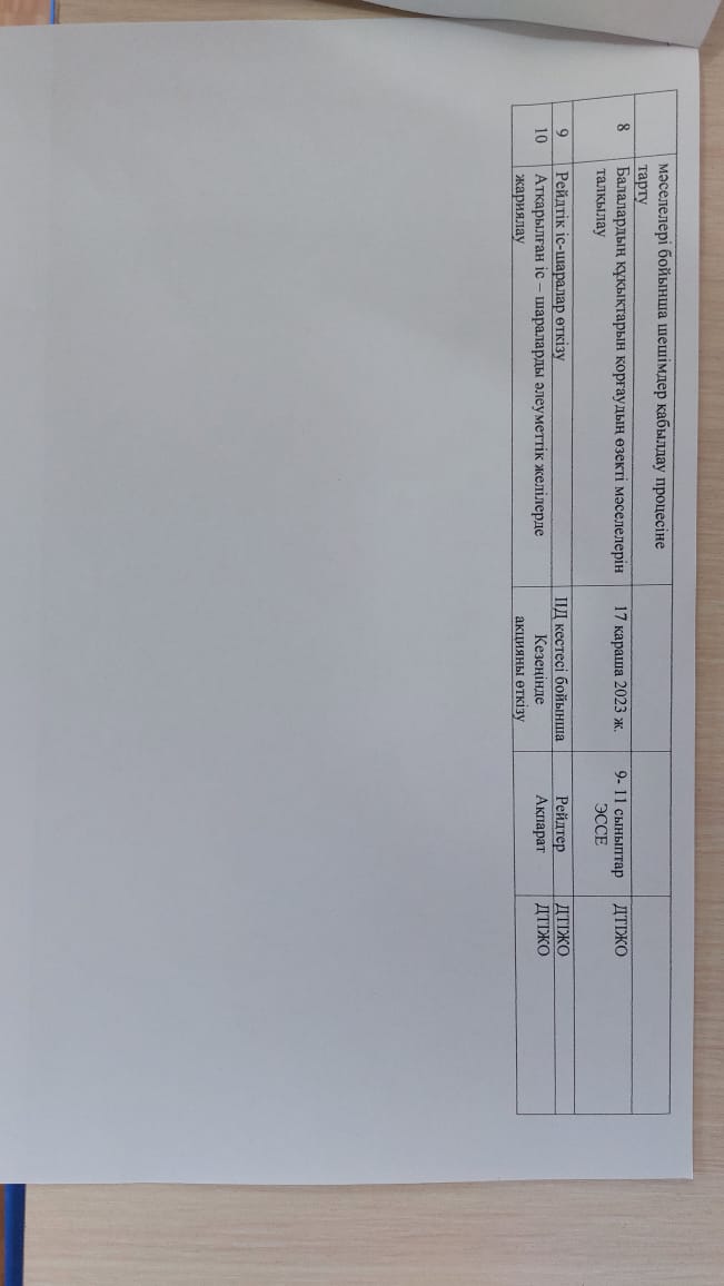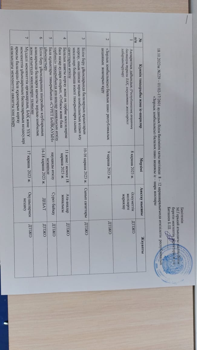 09.11.2023 жылы Түркістан облысы Шардара ауданының білім бөліміне қарасты М.Горький атындағы жалпы білім беретін мектебінде балалардың құқықтарын қорғау, оның ішінде зорлық зомбылықтың алдын алу мәселелері бойынша