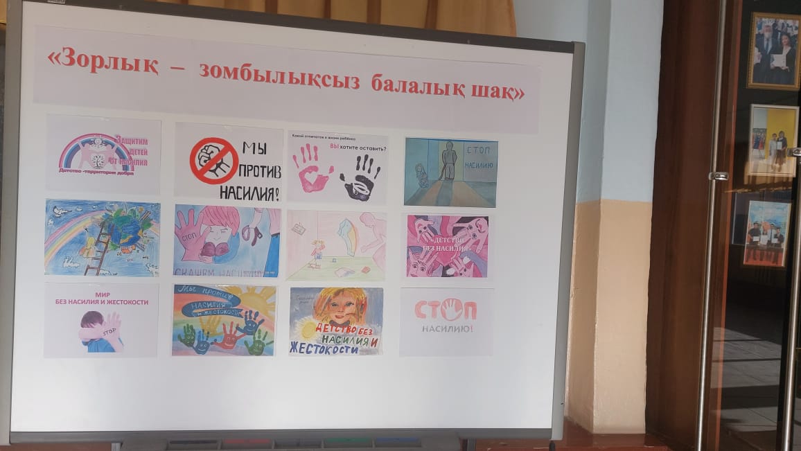 "Зорлық-зомбылықсыз балалық шақ" науқаны аясында жоспар құрылып, фойеге қабырға суреттері ілініп, мектеп білім алушыларына зорлық-зомбылық туралы мағлұмат беру барысында, өз жүрген орталарында мейірімді болуға, бұзақылық істерге бармауға, адами бойларындағы қасиеттерін сақтауға, әдепті де, тұлға болып өсуіне тәрбиелеу мақсатында түсіндірме жұмыстары жүргізілуде.